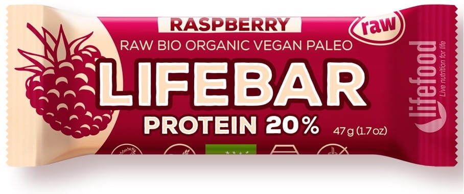 BATON PROTEINOWY Z MALINAMI RAW BEZ DODATKU CUKRÓW BEZGLUTENOWY BIO 47 g - LIFEFOOD