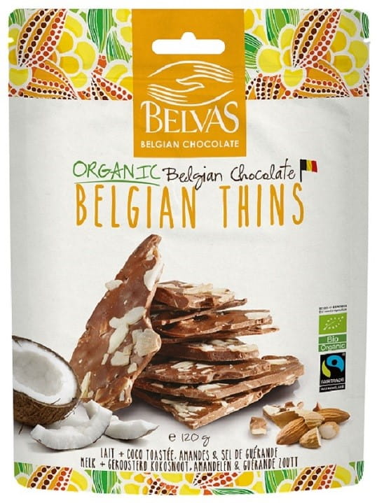 KAWAŁKI CZEKOLADY MLECZNEJ Z MIGDAŁAMI I KOKOSEM FAIR TRADE BEZGLUTENOWE BIO 120 g - BELVAS