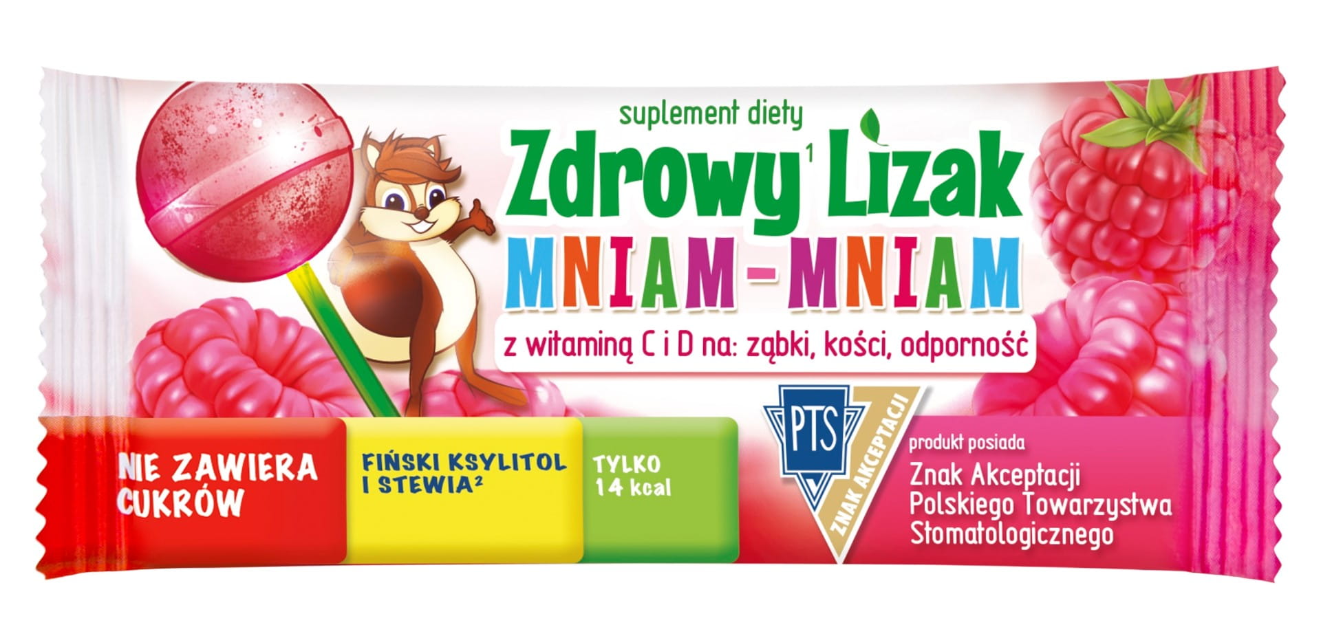Suplement diety. Lizak Mniam-Mniam o smaku malinowym zawiera zawiera substancje słodzące: fiński ksylitol oraz glikozydy stewiolowe. Spożywanie żywności zawierającej ksylitol zamiast cukru pomaga w zachowaniu mineralizacji zębów.