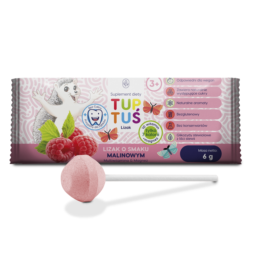 LIZAK O SMAKU MALINOWYM MULTIWITAMINA Z MAGNEZEM BEZGLUTENOWY 6 g - TUPTUŚ