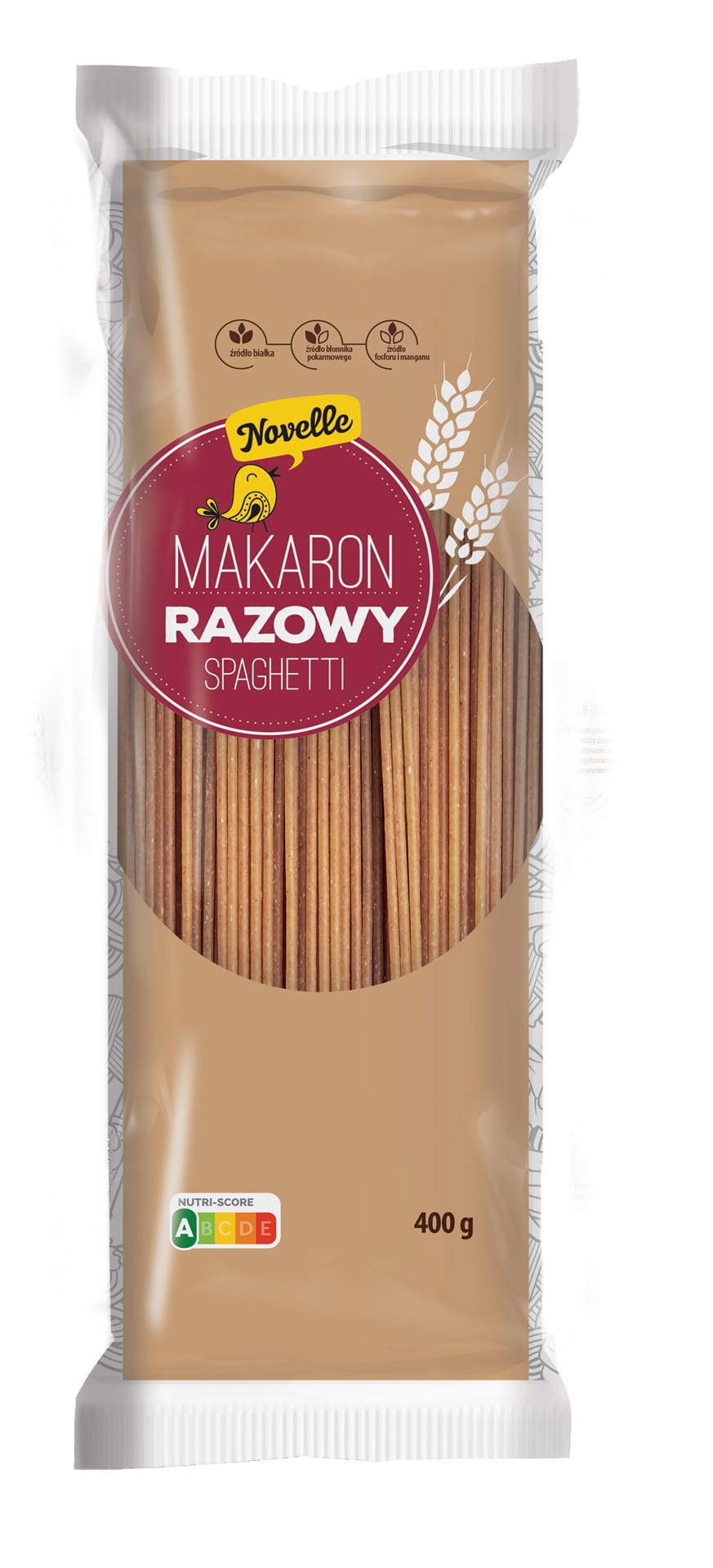 Novelle Makaron Razowy Spaghetti z mąki z pełnego przemiału to doskonałe urozmaicenie codziennej diety dzięki zawartości cennego dla organizmu błonnika pokarmowego i składników mineralnych takich jak fosfor i mangan.