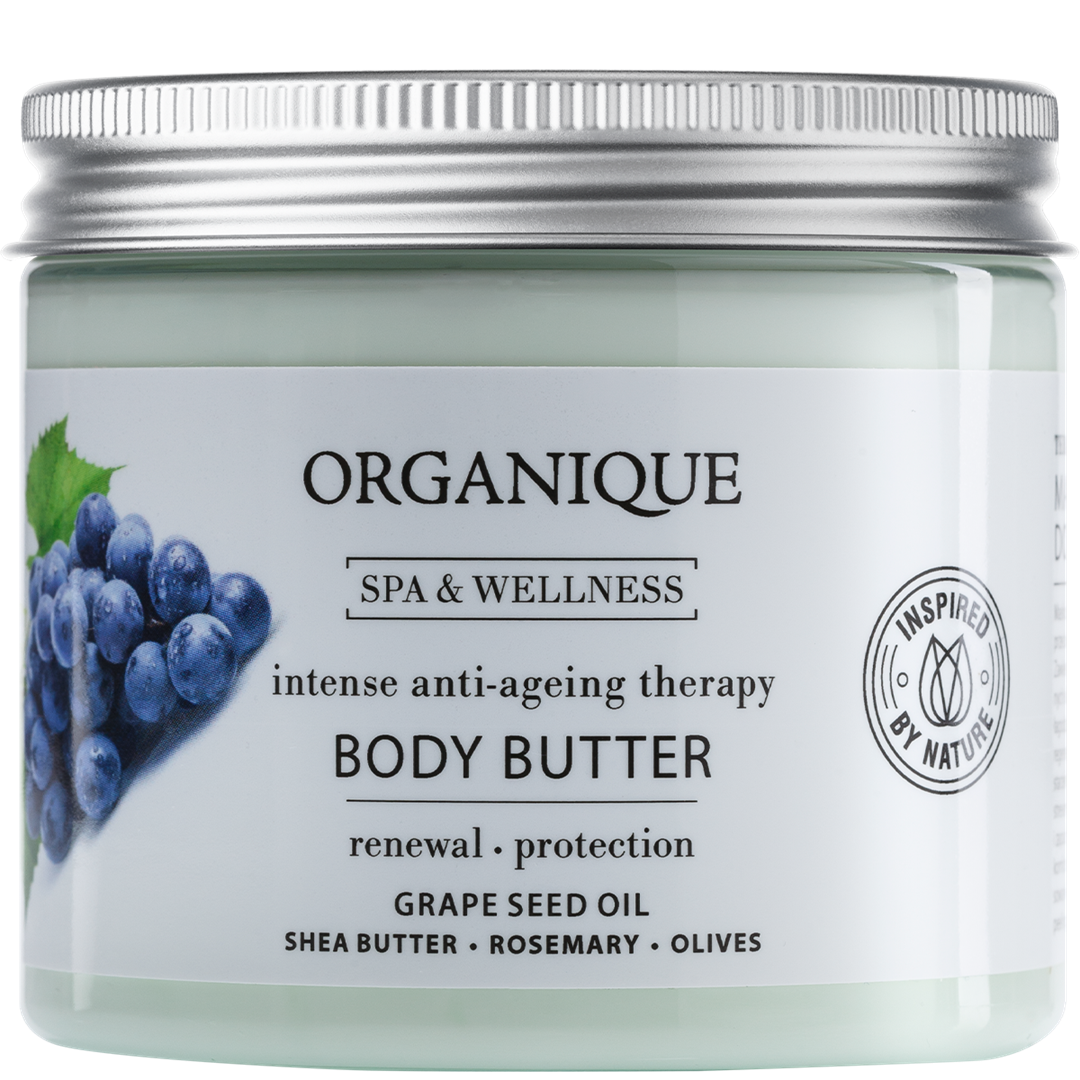 MASŁO do ciała przeznaczone do pielęgnacji przeciwstarzeniowej każdego rodzaju skóry. Zawiera bogatą kompozycję synergicznie dobranych składników: olejów, ekstraktów i substancji łagodzących. Zapewnia to intensywną odnowę, regenerację i nawilżenie. Zapobiega procesom starzenia i walczy z jego objawami, chroni przed stresem oksydacyjnym. Aksamitna konsystencja i zapach dojrzałych, słodkich winogron zwiększają komfort aplikacji. Najlepsze efekty zapewnia stosowanie kompletnej terapii przeciwstarzeniowej: peelingu, serum i masła.