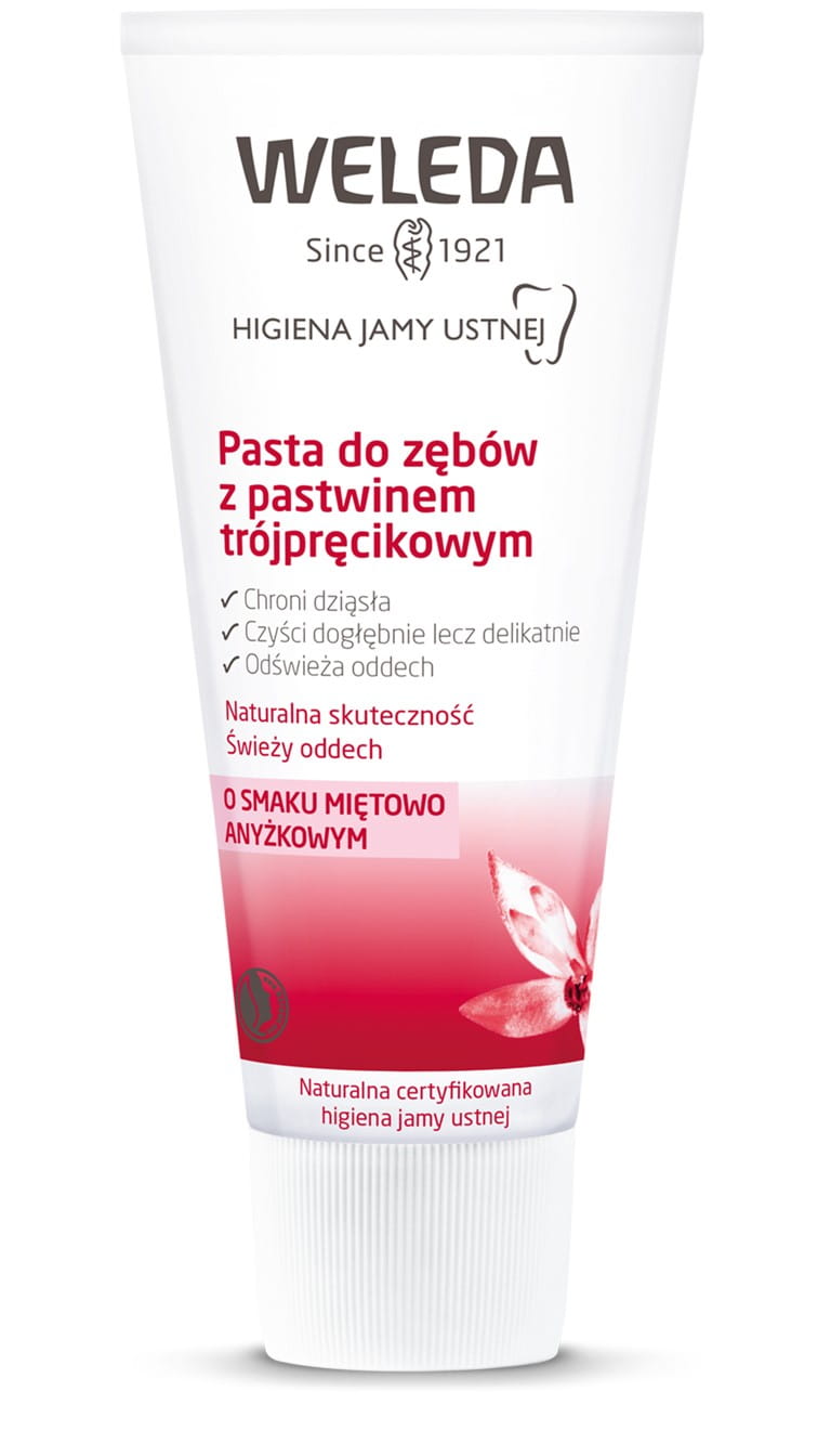 Mieszkańcy Peru w Andach tradycyjnie używają korzenia pastwina trójpręcikowego do czyszczenia zębów i odświeżania oddechu. Weleda poszła w ich ślady i od prawie 100 lat stosuje tę roślinę w produktach do higieny jamy ustnej. Pasta do zębów z pastwinem trójpręcikowym jest wzbogacona o czerwony korzeń rośliny i wyciągi z mirry, aby pomóc utrzymać jamę ustną oraz dziąsła w dobrej kondycji. Mineralne drobinki ścierające dokładnie, ale delikatnie oczyszczają zęby, a naturalne olejki eteryczne z mięty pieprzowej i kopru włoskiego pozostawiają jamę ustną w czystości oraz zapewniają długotrwale świeży oddech. Regularne szczotkowanie pastą do zębów Weleda zmniejsza płytkę nazębną, chroniąc przed ubytkami.