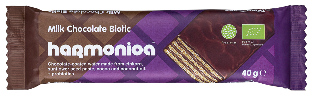 WAFELEK Z SAMOPSZY Z KREMEM MLECZNO - KAKAOWYM W POLEWIE Z MLECZNEJ CZEKOLADY Z PROBIOTYKAMI BIO 40 g - HARMONICA