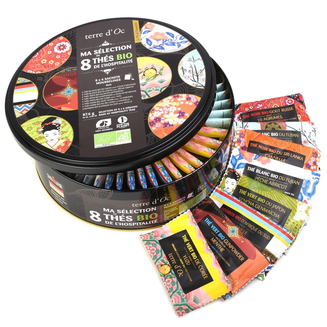 Zestaw 8 rodzajów herbat w torebkach marki Terre d'Oc - zapakowane w eleganckie, czarne pudełko z motywami graficznymi nawiązującymi do każdego rodzaju herbaty w środku.