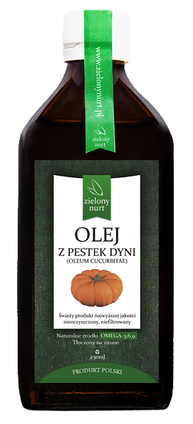 Olej z Pestek Dyni powstaje ze starannie wyselekcjonowanych pestek dyni. Tłuszcze zawarte w pestkach dyni zaliczają się do pełnowartościowych tłuszczów roślinnych, tak zwanych NNKT, które bezwzględnie musimy dostarczać wraz z pożywieniem. Jest doskonałym środkiem o działaniu przeciwpasożytniczym oraz niezwykle przydatny we wczesnych fazach przerostu gruczołu krokowego.