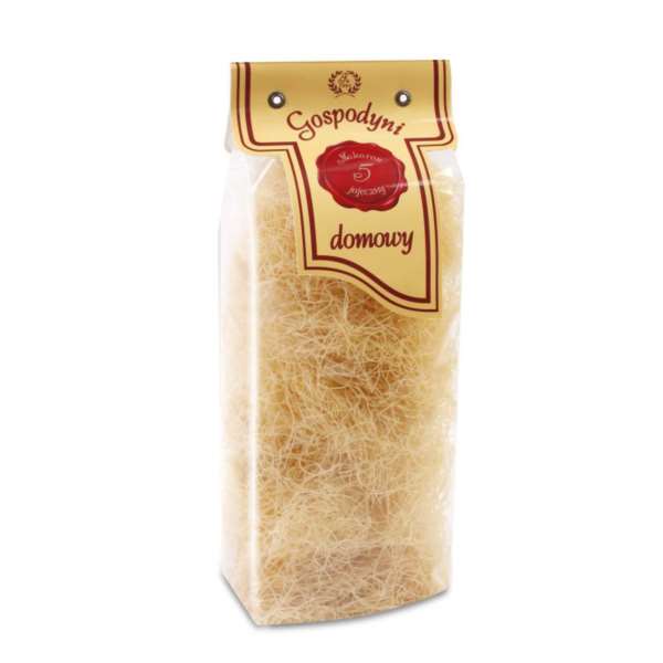 Tradycyjny makaron wałkowany, pięciojajeczny. Makaron polecany do zup - szczególnie dobrze smakuje z rosołem.