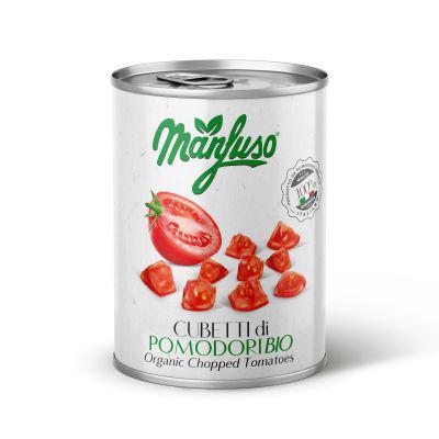 Ekologiczne pomidory pelati w kawałkach. Oryginalny włoski produkt prosto z okolic Neapolu. Produkty Manfuso znane są z wysokiej jakości. Produkt nadaje wyjątkowego smaku daniom kuchni Śródziemnomorskiej, zupom a różnego rodzaju sosom.